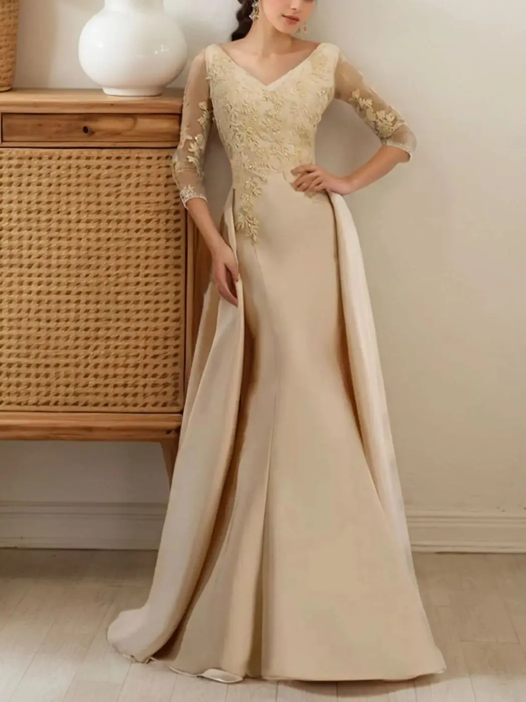 Evening Dress, Prom Gown, Wedding Guest Dress, Formal Dress, Elegant Gown, Mermaid Dress, Trumpet Dress, Lace Wedding Dress, Satin Formal Gown, V Neck Dress, 3/4 Sleeve Dress, Floor Length Dress, Appliques Dress, Customized Evening Gown, 2025 Prom Dress, Elegant Appliques Gown, Wedding Guest Attire, Formal Occasion Dress